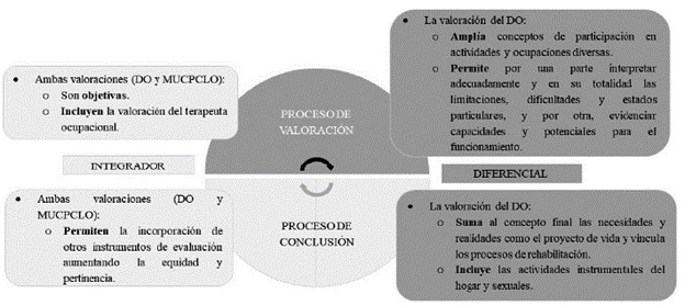 Basados en el sustento de la Figura 2 y en las reflexiones suscitadas a partir de los resultados, los autores del presente estudio identificaron la necesidad de articular el DO al proceso de valoración y establecer evaluaciones acordes con las exigencias del medio, que contemplen abordajes cotidianos y enfoques desde el modelo biopsicosocial. Finalmente, es necesario generar una calificación de PCLO correcta, independientemente del perfil profesional, puesto que en este punto la idoneidad no radica en la disciplina, sino en el procedimiento y rigurosidad para solicitar, revisar e interpretar la información que deriva de las evaluaciones ocupacionales, que son indispensables para la calificación de PCLO, en este caso del capítulo 3 del título II.
