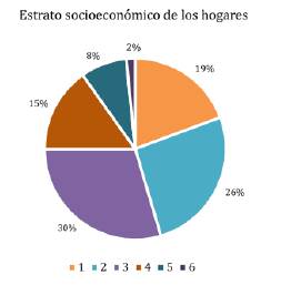 El estrato tres fue el que tuvo más participación del estudio, con un 30%; seguido del estrato dos con un 26%; tercero el estrato uno, con un 19%; el estrato 4, con un 15%; el estrato 5, con un 8% y finalmente el estrato 6 con un 2%. Si bien el porcentaje de participación es distinto, se identificaron hogares de diferentes estratos socioeconómicos.
