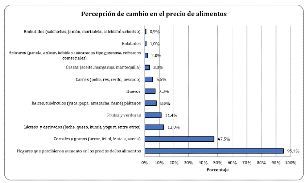 El 95,1% de los hogares que respondieron la encuesta manifestaron que los precios de los alimentos aumentaron en el trimestre evaluado y que los alimentos con mayor percepción de subida de precios fueron los cereales con un 47,5%, seguido de lácteos y derivados con 13%. Las frutas y verduras, raíces y tubérculos; huevos, carnes, grasas y azucares, enlatados y embutidos también fueron alimentos que las familias reportaron tuvieron aumento de precios durante la cuarentena.