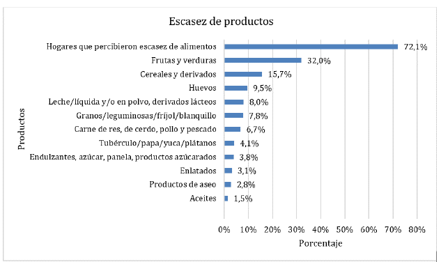Durante el primer trimestre del confinamiento por COVID-19, el 72,1% de los hogares evaluados reportaron percibir escasez en los alimentos. Para esta respuesta se clasificaron los hogares de mayor a menor, con respecto a la percepción, sobre si la escasez de alimentos era para un alimento o por grupos de alimentos.