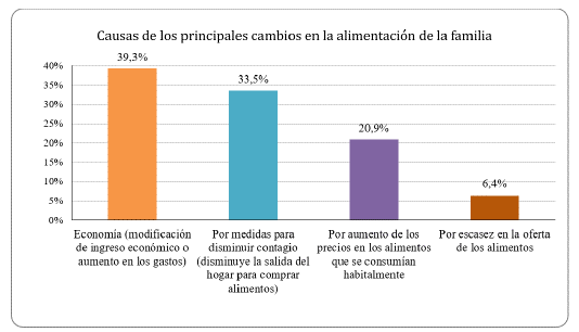 Sobre los factores relacionados con los cambios en la alimentación que presentaron las familias, fue el factor económico el más seleccionado: "economía" (39,3%), seguido de, "disminuir las salidas del hogar para prevenir el contagio" (33,5%), "aumento de los precios de los alimentos" con un 20,9%, y finalmente por "la escasez de oferta de alimentos" con un 6,4%.