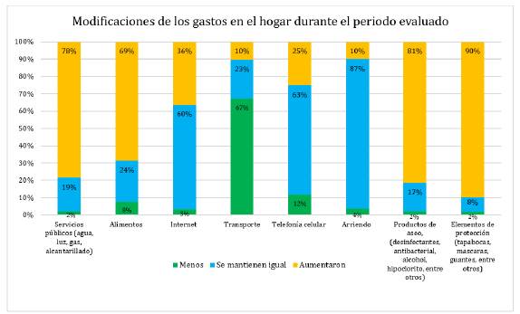 Los hogares reportaron además un aumento del 78% en el pago de los servicios públicos, considerando que las familias permanecieron más tiempo en sus en sus casas, es decir, se hizo mayor uso de estos servicios, en comparación al periodo anterior a la cuarentena. Por último, el gasto en la alimentación también aumentó considerablemente (69%), esto pudo ser debido a que se permaneció en el interior de las casas durante mucho tiempo y por ende, esto condujo a condiciones de estrés que pueden causar un cambio dramático en los hábitos alimenticios. Comer con estrés fue algo real, ya que las personas estaban ansiosas por su próximo cheque de pago, veían desaparecer la comida de los estantes de los supermercados y pasaban días enteros en casa, lo que les llevaba a comer en exceso29,30
