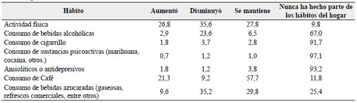 Frente al consumo de sustancias psicoactivas como alcohol, cigarrillo, otras (marihuana, cocaína) fueron más los hogares que disminuyeron el hábito durante el confinamiento. Con respecto a las bebidas gaseosas, la disminución de su ingesta fue superior que en la de aquellos que la aumentaron. El café, fue una bebida cuyo consumo aumentó en los hogares, en comparación de aquellos que lo disminuyeron y aunque en menor proporción, este comportamiento fue similar con las sustancias ansiolíticas.
