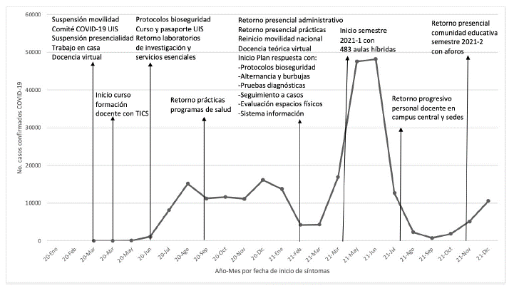 A partir de julio de 2021, la DGTH emitió los lineamientos para el retorno progresivo del personal docente en todas las sedes. El retorno a actividades académicas presenciales en toda la comunidad educativa UIS de los programas de pregrado y posgrado se realizó a partir del 2 de noviembre de 2021, para el inicio del semestre académico 2021-2, siguiendo los lineamientos establecidos en el Acuerdo del Consejo Académico n.° 340 del 12 de octubre de 2021. La línea de tiempo de los lineamientos institucionales y de la curva epidémica de casos COVID-19 en Santander durante 2020 y 2021 se presenta en la Figura 1.