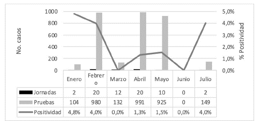 Con este componente se tuvo como propósito la reducción del riesgo de transmisión a partir de la identificación temprana de personas infectadas en la comunidad universitaria, lo que permitió su aislamiento y el de sus contactos de manera oportuna. La realización de pruebas se inició desde finales de enero de 2021 para el ingreso gradual de funcionarios administrativos, y fueron realizadas en el Laboratorio Central de Investigaciones (LCI) de la Facultad de Salud, avalado como laboratorio colaborador del INS para la realización de pruebas de PCR para SARS-CoV-2. Entre enero y julio de 2021 se realizaron 66 jornadas de tomas de muestra en funcionarios y docentes y se procesaron 3281 muestras de RT-PCR por el LCI. Se registró una positividad acumulada de 2,3%. La Figura 2 muestra la cantidad de pruebas y el porcentaje de positividad por mes entre enero y julio de 2021, excepto en el mes de junio que no se realizaron pruebas.