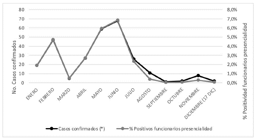 Se realizó una descripción narrativa del proceso, a partir de la revisión documental, y una construcción de la secuencia temporal de lineamientos y desarrollo de actividades de prevención y control. Para el análisis descriptivo de los casos sospechosos y confirmados de COVID-19 en la comunidad universitaria, se utilizaron frecuencias y proporciones de casos registrados a partir de los informes consolidados por el sistema de vigilancia institucional.