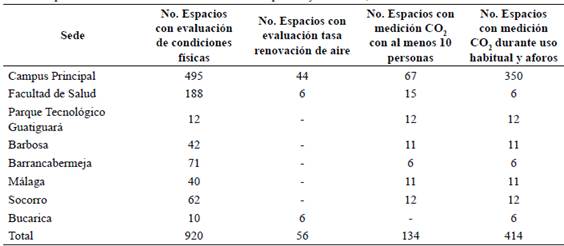 Este componente fue liderado por la División de Planta Física y respondió al conocimiento del efecto de la reducción del riesgo de transmisión relacionado con la capacidad en los espacios físicos para mantener el distanciamiento físico de sus ocupantes y contar con adecuadas condiciones de ventilación, particularmente en espacios cerrados. El desarrollo de este componente en 2021 se realizó en las siguientes fases. 1) Evaluación de las condiciones físicas de aulas y oficinas: se realizó a partir del segundo semestre de 2020 con un censo detallado en el que se identificaron 48 espacios en el campus principal que requirieron de mejoras en sus condiciones. 2) Medición piloto de concentración de dióxido de carbono (CO2 como medida indirecta de ventilación): en marzo de 2021 se hizo un piloto de medición de CO2 en aulas de la Facultad de Salud, y en mayo se realizó la compra de 9 monitores de CO2 para las diferentes sedes de la Universidad. Entre mayo y junio de 2021 se realizaron mediciones pilotos de concentraciones de CO2 en espacios cerrados con presencia de al menos 10 personas siguiendo la "Guía de evaluación de ventilación en entornos educativos"12. Se observó, de manera general, que las concentraciones en espacios con condiciones de ventilación cruzada fueron adecuadas con niveles inferiores a 700 ppm. 3) Evaluación de la tasa de renovación de aire en aulas y oficinas: se realizó entre junio y agosto, usando el método de aula desocupada con hielo seco para generación de CO2. De las 56 aulas/oficinas evaluadas, se identificaron 11 espacios (19,6%) con tasas menores a 5 que requirieron adecuación de sus condiciones físicas; con base en estos resultados y en la medición del área, se definieron los aforos en cada aula. 4) Medición de CO2 en aulas y oficinas en condiciones habituales de uso: una vez se hizo el retorno total a las actividades presenciales, en noviembre de 2021, se realizaron mediciones de concentraciones de CO2 en espacios cerrados en condiciones habituales de uso con aforos. Del total de 414 aulas/oficinas/laboratorios/auditorios evaluados, se identificaron 11 espacios (2,7%) con niveles de CO2 superiores a 800. Los resultados de estas mediciones orientaron la implementación de acciones de mejora en esos espacios físicos. En la Tabla 2 se presenta el total de espacios evaluados en sus condiciones físicas y de ventilación por sedes en la Universidad.