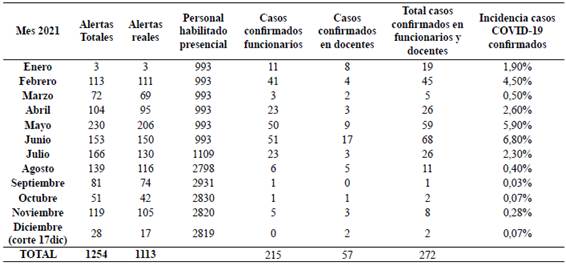 Entre funcionarios y docente, durante el año 2021, se reportaron 1113 alertas reales generadas por el pasaporte digital de movilidad, correos electrónicos y reportes telefónicos; de estas, se confirmaron 272 casos de COVID-19 (24,4% de las alertas reales recibidas) incluidos los casos confirmados por pruebas diagnósticas realizadas por la Universidad y reportes de EPS. En febrero y entre mayo y julio se reportó la mayor cantidad de casos confirmados. La Tabla 3 muestra el detalle de alertas, casos confirmados y prevalencia de casos positivos en funcionarios y docentes por mes durante 2021, y la Figura 3 muestra la incidencia de casos confirmados por mes. De los 272 casos confirmados en 2021 entre funcionarios y docentes, 157 casos (57,7%) fueron en mujeres. La distribución de casos por grupos de edad muestra que 97 casos (35,7%) se dieron en personas entre 20 y 40 años, 146 casos (52,6%) fueron en personas entre 41 y 60 años y 27 casos (9,9%) ocurrieron en personas mayores de 60 años; en 5 casos (1,8%) no se reportó dato de edad. Se registró un total de 3 fallecimientos del total de casos confirmados, para una letalidad de 1,1% en la comunidad de funcionarios y docentes UIS en 2021. De estos casos, 2 correspondieron a funcionarios administrativos (letalidad 0,9%) y 1 a docentes (letalidad 1,8%). Casi la totalidad de casos tuvieron como probable fuente de contagio un contacto estrecho de tipo familiar o social fuera del ámbito laboral de la Universidad. Entre los funcionarios administrativos, la mayor proporción de casos se dio en las unidades de División de Planta Física (30 casos) y División Financiera (21 casos). Por su parte, entre los docentes, la mayor proporción de casos confirmados se presentó en las facultades de Ciencias (16 casos) y Ciencias Humanas (11 casos). Se presentó un conglomerado en la División de Gestión de Talento Humano, en mayo, por 3 casos positivos en una semana.