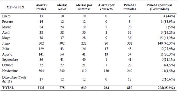 La cantidad de estudiantes en presencialidad fue variable entre enero y octubre de 2021, y a partir del 2 de noviembre se retornó a presencialidad total en los campus UIS. Durante 2021 se reportaron 1121 alertas por pasaporte de movilidad, y de estas 835 (74%) fueron alertas reales. Se tomaron pruebas a 810 estudiantes que reportaron alertas (72%) y se confirmaron 208 casos (25,6%). La mayor positividad de casos en estudiantes se registró en febrero y, luego, entre mayo y junio de 2021. Las investigaciones de casos permitieron identificar la relación de algunos casos positivos con asistencia a fiestas de Halloween en lugares públicos de la ciudad. La Tabla 4 presenta el resumen de alertas reportadas y casos confirmados en estudiantes por mes durante 2021. De los 208 casos confirmados en 2021 entre estudiantes, 123 (59,1%) fueron en hombres. La distribución de casos por grupos de edad muestra que 42 (20,2%) fueron casos entre 15 y 19 años, 146 casos (70,2%) fueron entre 20 y 25 años y 20 casos (9,6%) ocurrieron en mayores de 25 años. Casi la totalidad de casos tuvieron como probable fuente de contagio un contacto estrecho de tipo familiar o social fuera de la Universidad. En el segundo semestre del 2021 se reportaron al equipo técnico de respuesta COVID-19 UIS 3 conglomerados en unidades académicas relacionados con estudiantes: 1 en la Escuela de Medicina en el mes de agosto y 2 en la Escuela de Derecho en el mes de noviembre. No se registraron fallecimientos y solo 1 estudiante mayor de 25 años ingresó a unidad de cuidado intensivo. El análisis de casos totales confirmados por unidades académicas muestra que entre los estudiantes la mayor proporción de casos confirmados se presentó en las Facultades de Ciencias Humanas con 80 casos (38,4%) y la Facultad de Salud con 75 casos (36%).