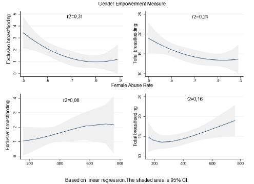 The gender empowerment measure as a proxy of woman's formal inclusion in the work environment is the most determinant variable of EBF and BF. When women's empowerment is greater, poverty is lower and their ability to determine themselves is greater. Therefore, while poverty in the territory is directly related to BF, empowerment is negatively related. An inverse relationship of employment with BF and duration has been consistently reported in various societies and studies9,10. Several solutions have been proposed, such as approving paid BF licenses33,34, maintaining daycare centers incorporated in large industries, establishing insurance policies to meet the medical care related to BF35, giving women break time to breastfeed during the workday, and creating BF-friendly environments in public places36. However, it is consistently reported that returning to work marks the end of BF; therefore, the search for viable alternatives for women, the work environment and the finance of the state remains. GEM is a variable that despite being formally limited by the indicator of UNDP to three dimensions encompasses many more. GEM is transversal to other dimensions and should be understood as the ability to decide in many other aspects. In turn it would be desirable that future studies explored new ways of approaching the concept of GEM.