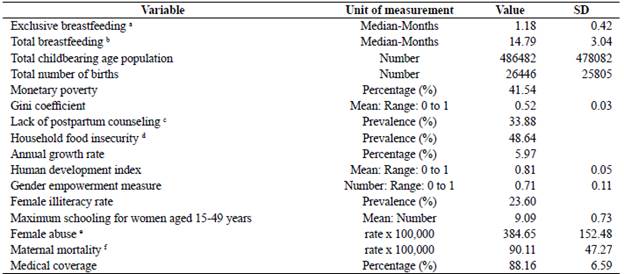 The two output or dependent variables were the median duration (in months) of EBF and BF. The data were obtained through direct interviews from a representative sample of 9,389 mothers with children under 36 months that were included in ENSIN-201014 and was summarized in 24 geodemographic units. The construction of the breastfeeding variables was done in a "compositional" way, starting from individual data and summarized in a population variable19. The information used was reported in the official report of the ENSIN-201014.