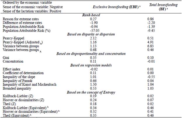 The analysis of the set of indices allows a reasonable conclusion regarding the existence or nonexistence of economic inequality, in this case in the duration of EBF and BF. The economic inequality in the duration of EBF and BF in Colombia, in relative terms, is greater for EBF. However, in general terms, for both EBF and BF, inequality is nonexistent or is low. The different indices calculated for EBF are in the range of nonexistence of inequality or are acceptable. This finding is consistent with a study of other variables of interest for nutrition in Colombia, such as time in front of screens (excess of watching television or playing video game) and adds evidence to the breach of the basic paradigm in the study of economic inequalities in health, i.e., "the poor are in a worse condition than the most privileged"13. In Colombia, at an ecological level and based on the median duration of EBF and BF, both poor and privileged territory are below what is recommended by the WHO as acceptable for the duration of BF. The nonexistence of economic inequality contradicts evidence at the individual level shown in other countries7,10,29. However, the results are not comparable since the cultural, social and economic contexts are different. The failure to meet the duration goals recommended by the WHO is a trend worldwide32.