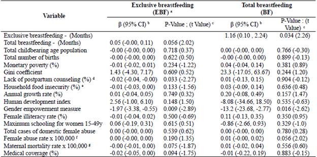 Results: EBF lasted 1.18 months (95% CI: 1.00 to 1.36), and BF lasted 14.79 months (95% CI: 13.50 to 16.08). Economic inequality was low, and the Gini coefficient was 0.35 for EBF and 0.10 for BF. The EBF duration is affected by the gender empowerment measure (GEM) (β =-1.94, p=0.006) and medical coverage (%) (β =-0.02, p=0.060). The BF duration is explained by the monetary poverty (β =0.12, p=0.007) GEM (β =-9.94, p=0.033) and female abuse rate x 100,000 (β =0.01, p=0.005).