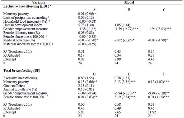 EBF and BF are phenomena explained differently. There is no economic inequality in the duration of EBF and BF. However, care must be taken when interpreting the above statement and all those made in this discussion for various aspects; a) the median duration of exclusive and total breastfeeding is far from a desirable minimum in all the territories studied, b) all the inequality indices are methodologically product at most of bivariate analyzes, c) the same set of values in the indices inequality can be interpreted differently, here it is important to state that there is no perfect equality and that, for example, in developed societies such as Switzerland and Canada, which are examples of equality, the Gini coefficient for 2010 was 29.1 and 33.6 respectively31. The territories where women participate more in politics, and in general in development activities that look for equality with men, are inversely related to the duration of the BF. A relevant and novel finding is that in the territories where there is greater abuse towards women, the abuse was directly related to the duration of the BF, explained as a hypothesis, by affective compensation of women with their children. The impact of social and human development is greater than the economic aspect as a determinant of EBF and BF duration in Colombia. Models C and F for their parsimony and explanatory power would be the basis for public policy in BF in Colombia.