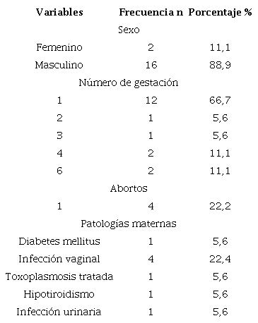 El promedio de edad de los participantes fue de 24,33 días de edad. El 88,9 % eran varones, el peso promedio fue de 3927 gramos al nacer (tan solo 2 presentaban sobrepeso al nacer) y la estatura promedio fue de 52 centímetros (cm). Ninguna de las gestantes tenía antecedente de consumo de alcohol, tabaco o sustancias psicoactivas, las características de la población se describen en la Tabla 1.
