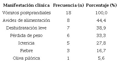 Resultados: En total, se incluyeron 18 pacientes que cumplían con los criterios de selección. El promedio de edad de los participantes fue de 24,3 días de edad. La mayoría eran varones, asimismo, dos pacientes presentaban sobrepeso al nacer. El síntoma predominante fue la emesis posprandial en un 100 %. El diagnóstico se realizó mediante las medidas del píloro con ecografía abdominal y a la totalidad de los pacientes se les realizó piloromiotomía, de los cuales uno solo requirió una reintervención, sin embargo, ningún paciente falleció.