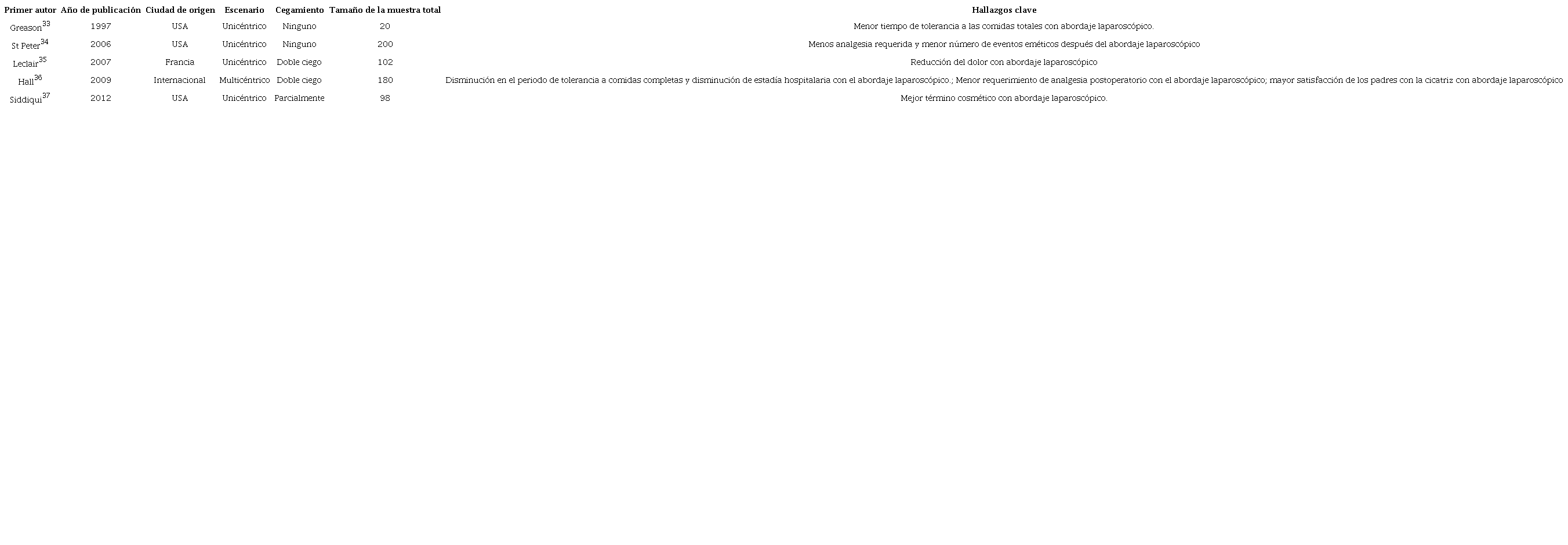 Existen diferentes abordajes descritos para la realización de la piloromiotomía como manejo quirúrgico definitivo, entre los que se encuentra el tradicional (cuadrante superior derecho), el abordaje circumbilical y la piloromiotomía intracavitaria27-30. Una revisión sistemática de 502 pacientes (4 estudios controlados randomizados) demostró una superioridad del abordaje laparoscópico sobre el abierto al ser menos invasivo, y teniendo en cuenta el reinicio de la alimentación completa enteral más temprano que con el abordaje abierto31-38. En la Tabla 3 se resumen los hallazgos comparativos del abordaje laparoscópico sobre el convencional.