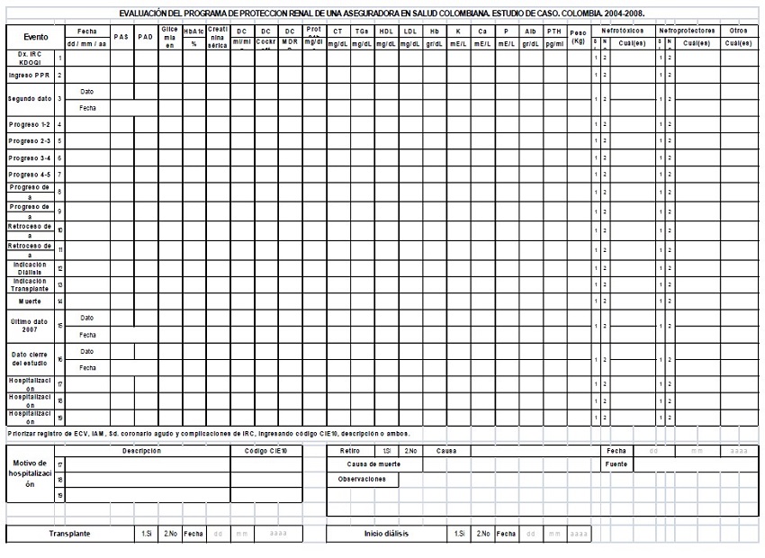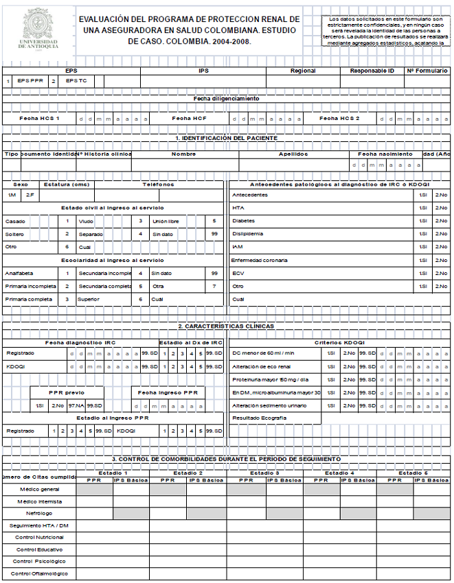 Al instrumento físico y las variables contenidas se le realizaron inicialmente pruebas de contenido por los investigadores con expertos en nefrología y estadística para lograr que su contenido fuera suficiente, pertinente, exhaustivo y breve. Se definieron las variables para que los datos fueran recolectados en su expresión básica, y en los casos en que no se encontró el dato de la depuración de creatinina, los recolectores del dato la calcularon con las fórmulas estandarizadas de Cockcroft-Gault y MDRD respectivas, cuyo resultado fue verificado por otra persona.