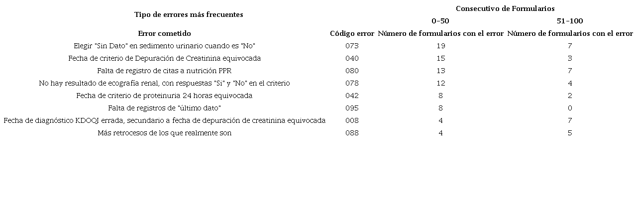 La proporción de errores encontrados en los primeros 700 formularios verificados se relacionaron por tipo de error, así: identificación del paciente 13 %, diagnóstico ERC 13 %, ingreso al PPR y estadios 13 %, PPR previo 2 %, criterios KDOQI 40 %, registro de cambio de estadio 21 % y otros 8 %. Cinco de los 50 (10 %) primeros formularios y diez (20 %) de los siguientes 50 no presentaron ningún error. La Tabla 1 muestra el número de errores dentro de cada formulario, para cada uno de los tipos de errores más frecuentes e importantes, en general pasó a ser menor en el segundo grupo.