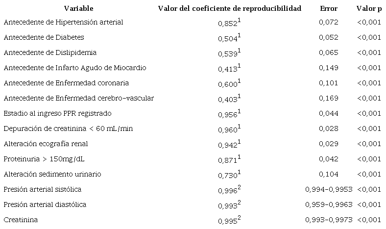 Los índices de Kappa obtenidos para las variables de mayor importancia, como son los criterios diagnósticos de ERC, depuración de creatinina, alteración de la ecografía renal, la proteinuria, y el estadio al ingreso fueron mayores a 0,8 y fue de 0,73 para la alteración del sedimento urinario. Los CCI para la presión arterial sistólica y segunda medición de presión diastólica después del diagnóstico y la creatinina sérica al momento del diagnóstico igualmente indican buena correlación. La Tabla 2 muestra que todos estos valores fueron significativamente distintos de los esperados por el azar.