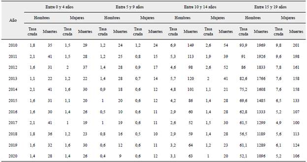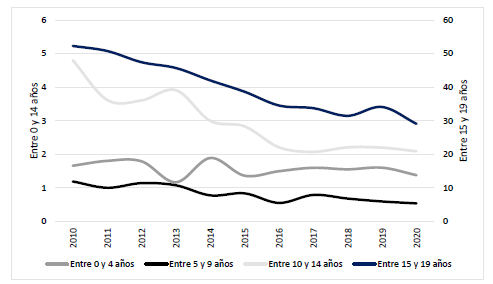 Durante el periodo de estudio 2010-2020 la tasa de homicidios por cada 100 000 niños, niñas y adolescentes en Colombia tuvo una clara tendencia decreciente, sin embargo, la pendiente fue más marcada en el grupo de edad de 15 a 19 años, con una tasa de 52,3 homicidios en el 2010 y 29,1 en el año 2020. Por otra parte, el grupo de 0 a 4 años de edad tuvo el menor decrecimiento de toda la población analizada al pasar de 1,7 homicidios en el 2010 d 1,4 homicidios por cada 10000(1 niños y niñas de e2a edad en el 2020.