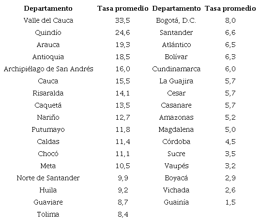 Los cinco departamentos que tuvieron una mayor tasa cruda promedio departamental por cada 100 000 de niños, niñas y adolescentes de homicidios fueron Valle del Cauca con 33,5, Quindío con 24,6, Arauca con 19,3, Antioquia con 18,5 y finalmente, el Archipiélago de San Andrés con 16,0 homicidios.