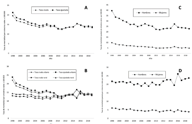 Entre 1998 y 2019 se presentaron 139 323 muertes por siniestros viales en el país. El año de mayor incidencia fue 1998, con una tasa de 19,61 por 100 000 habitantes, la cual fue disminuyendo progresivamente en los años siguientes. Para el 2015 se presentó la mayor tasa de mortalidad en el periodo de observación, la cual alcanzó 15,38 muertes por 100 000 habitantes (Figura 1-A).