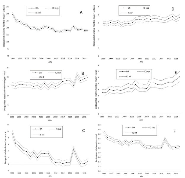 El análisis de las desigualdades absolutas mostró que las diferencias en la mortalidad por siniestros viales entre hombres y mujeres fueron estrechándose en el área urbana, contrario al comportamiento del área rural, en donde se presenta una tendencia al aumento. En el caso de la comparación urbano y rural, las diferencias han venido estrechándose durante el periodo de observación. En los años 2010 a 2014 y 2017 a 2018 no se presentaron diferencias entre las áreas urbanas y rurales (Tabla 2 y Figuras 2-A,2-B y2-C).