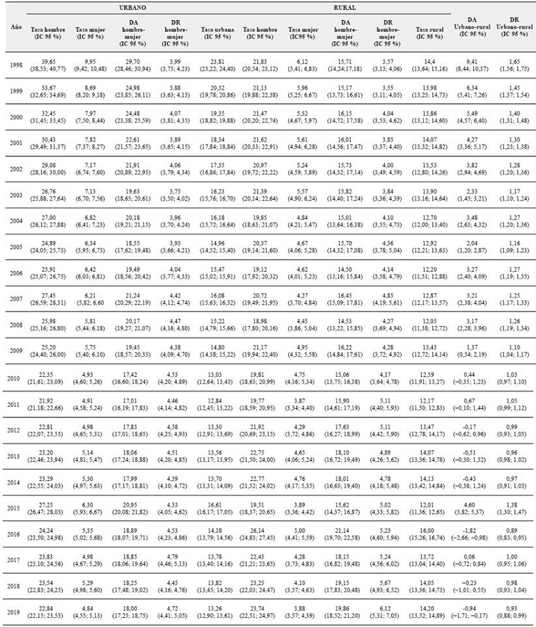 Materiales y métodos: Estudio ecológico a partir del análisis de las tasas de mortalidad ajustadas de los grupos poblacionales urbanos y rurales estratificados por sexo. Se hicieron análisis con regresión de Joinpoint y se calcularon medidas de desigualdad simple absoluta y relativa.