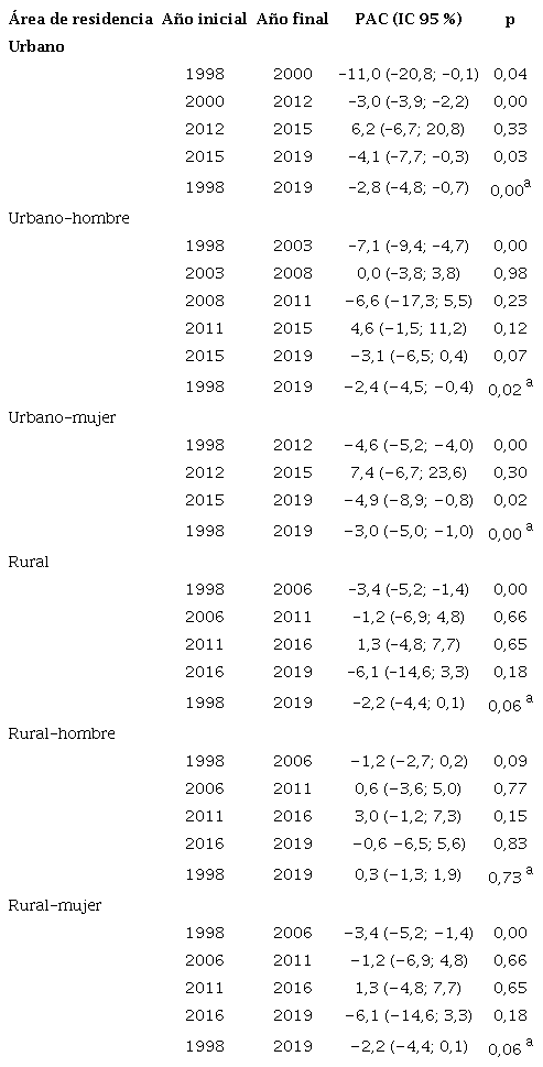 En el caso de los hombres de áreas urbanas se registró un punto de inflexión para el periodo 1998-2003, con un PAC de -7,1 (IC95 %= -9,4; -4,7). Para el periodo de observación se registró un CPAP de -2,4 (IC95 %= -4,5; -0,4). En las mujeres se presentaron dos puntos de inflexión. El primero para el periodo 1998-2012, con un PAC de -4,6 (IC95 %=-5,2; -4,0); y el segundo para el periodo 2015-2019, con un PAC de -4,9 (IC95 %=8,9; -0,8). Para el periodo de observación se registró un CPAP de -3,0 (IC95 %= -5,0; -1,0) (Tabla 1).