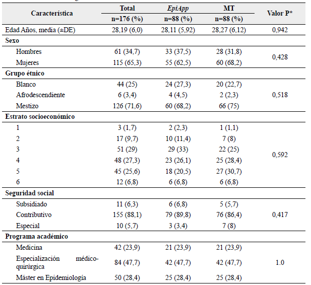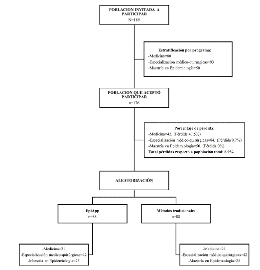 El proceso de selección se presenta en la Figura 1, las pérdidas totales con respecto a la población total fueron 6,9 % del estimado 15 %. Un total de 88 estudiantes fueron aleatorizados al grupo EpiApp y 88 al grupo MT: medicina 23,9 °%, residentes 47,7 % y maestría en epidemiología 28,4 %, en cada grupo.
