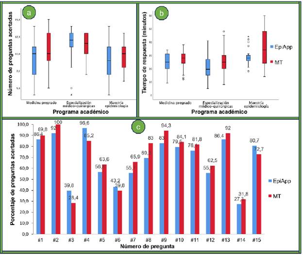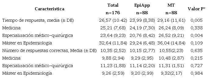 En la Tabla 3 y en la Figura 2 se muestra que el tiempo de respuesta en minutos fue significativamente menor para los usuarios de EpiApp, en comparación con los usuarios de métodos tradicionales, y también se presenta que, el número de respuestas acertadas por grupo de estudio fue igual (P = 0,635).