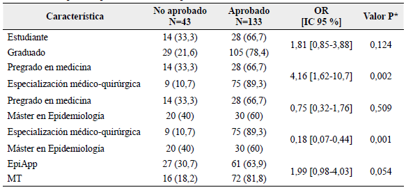 En la Tabla 2 se presenta que usar EpiApp no se asoció con no aprobar la prueba, mientras que, al estratificar los niveles de formación, la oportunidad de pertenecer a medicina y no aprobar fue 4,16 veces mayor que estar en especialización (P = 0,002), a su vez, ser especialista médico-quirúrgico y no aprobar tuvo una razón de oportunidad de 0,82 veces menor que entre los que pertenecían a la maestría en epidemiología (P < 0,05).