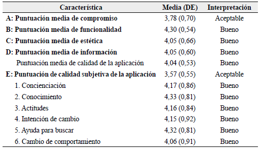 La evaluación de la usabilidad de la aplicación según la escala MARS se presenta en la Tabla 4, donde se muestra que en el puntaje global fue de 4,04 (± DE 0,53); donde el puntaje de calidad específico para conciencia, conocimiento, actitudes, intención de cambio, búsqueda de ayuda y cambio de comportamiento fue mayor que 4 "bueno", mientras que el puntaje de calidad subjetiva fue de 3,57 (± DE 0,55).