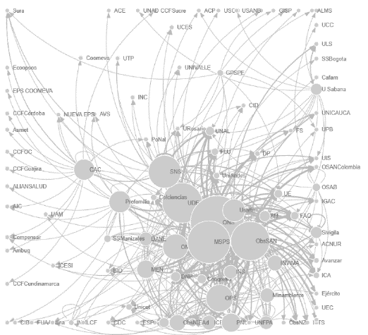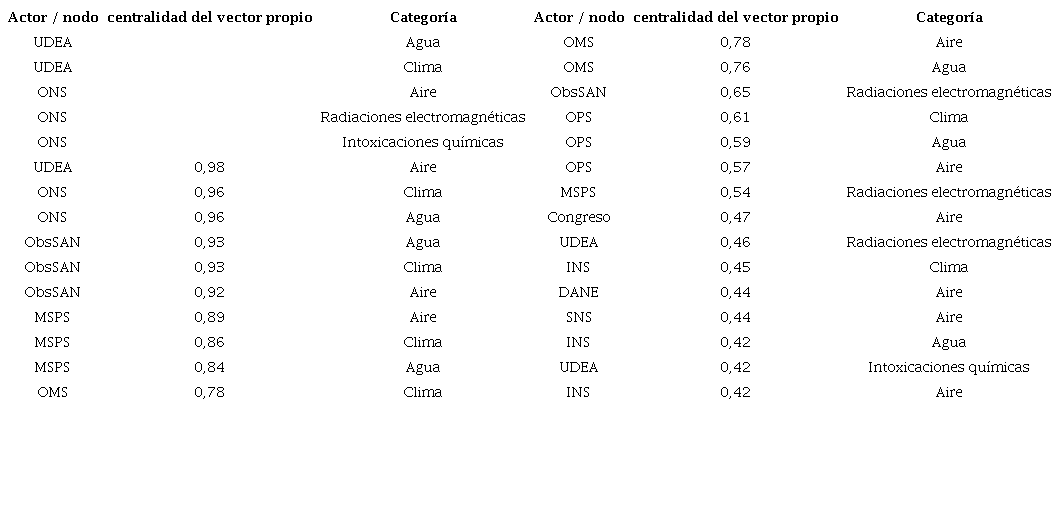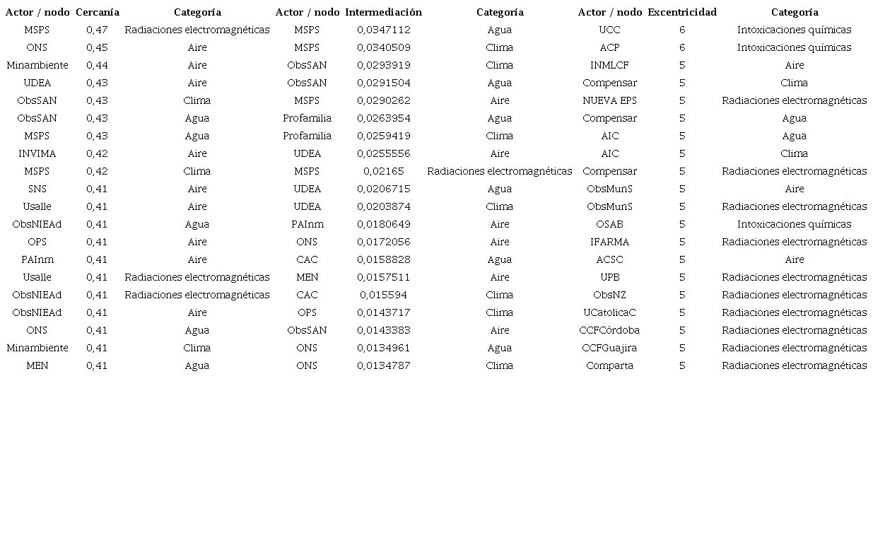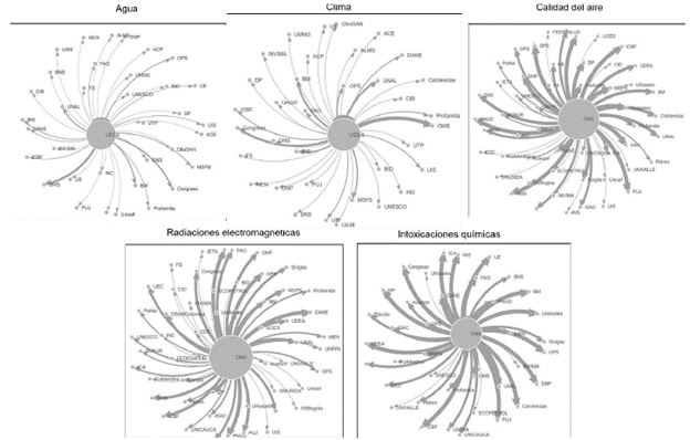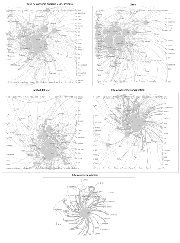 Results: Actors with greatest centrality in the network: Ministry of Health and Social Protection, Health Superintendency, Profamilia, Antioquia and La Salle universities, National Health Observatory, Bogota's Observatory of Environmental Health, the Pan American Health Organization and the World Health Organization. The five categories analyzed provides a low centrality degree, and water and climate categories presented greater participation by actors (more nodes and links).