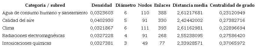 Las cinco subredes no estaban centralizadas y la subred de intoxicaciones químicas tuvo la mayor centralidad de grado, lo que significa que, al existir numerosas relaciones, esta subred sería popular, menos dependiente y tendría diversas formas de satisfacer las necesidades que demandan los actores (Tabla 1).