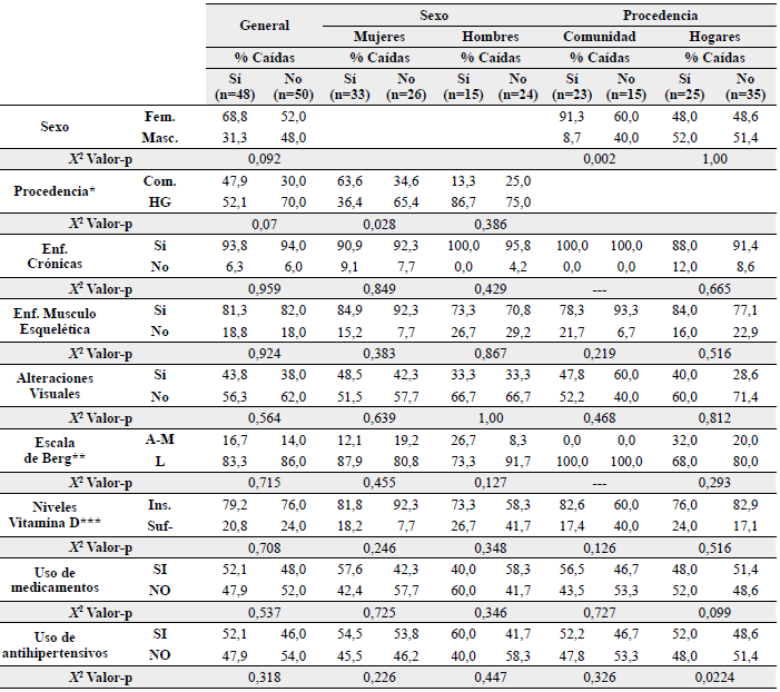 La Tabla 1 que relaciona los factores de riesgo según sexo y procedencia muestra que el 68,8 % de los adultos mayores que presentaron caídas fueron mujeres, sin significancia estadística (valor p de 0,092), pero cuando los adultos mayores provenían de la comunidad y no de un hogar geriátrico sí fue significativo (valor p de 0,002), con un porcentaje mayor de caídas en mujeres (91,3 %) en comparación con los hombres (8,7 %). Lo contrario sucedió en los hogares geriátricos, donde cayeron en mayor proporción los hombres con un 52 % y en un 48 % las mujeres, sin diferencias significativas (valor p de 1,0). Por tanto, se encontró asociación estadística entre procedencia y caídas en mujeres, asi como asociación entre sexo y caídas en personas provenientes de comunidad.