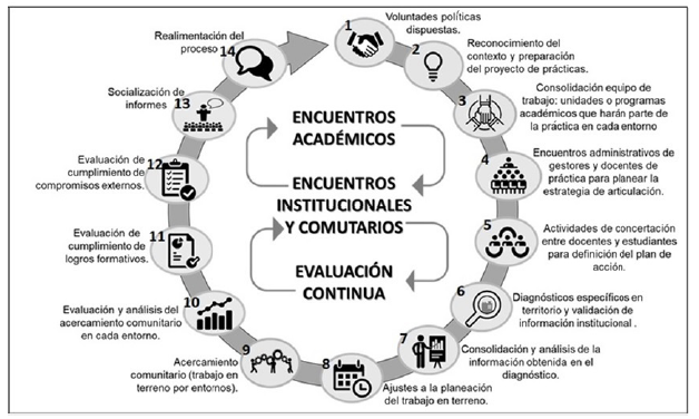 Cada experiencia de articulación de práctica depende de la planeación que se haga, de acuerdo con las problemáticas o necesidades que se prioricen, las lecturas que se hagan de los planes de desarrollo de los municipios, de los programas académicos o áreas del conocimiento que se vinculen al proceso y de los equipos interdisciplinarios que se conformen, teniendo en cuenta la institucionalidad y los líderes comunitarios.