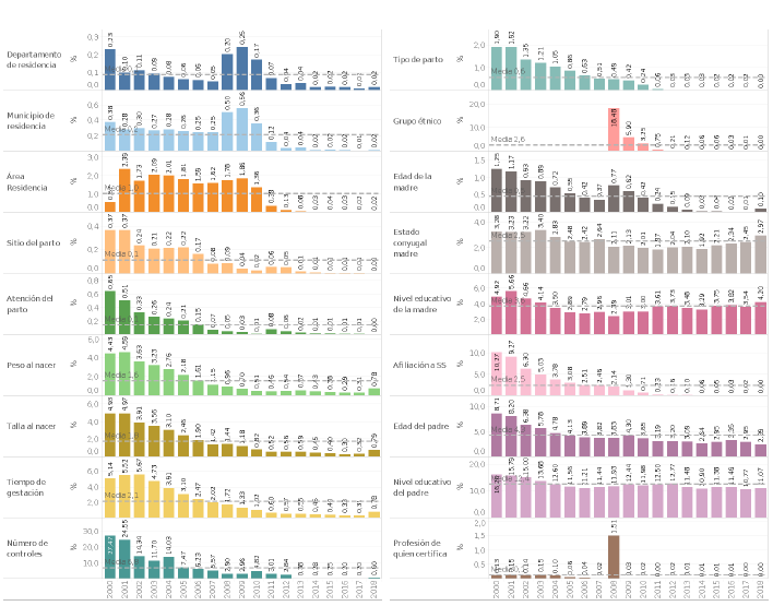 Esta característica mejoró con el tiempo (Figura 1). Los datos perdidos en la mayoría de las variables analizadas no excedieron el 5 % en ningún año; no obstante, cuatro características presentaron grandes porcentajes de pérdida: edad del padre, nivel educativo de ambos padres y número de controles prenatales. En contraste, las variables con menor omisión fueron el departamento, municipio y área de residencia de la madre.