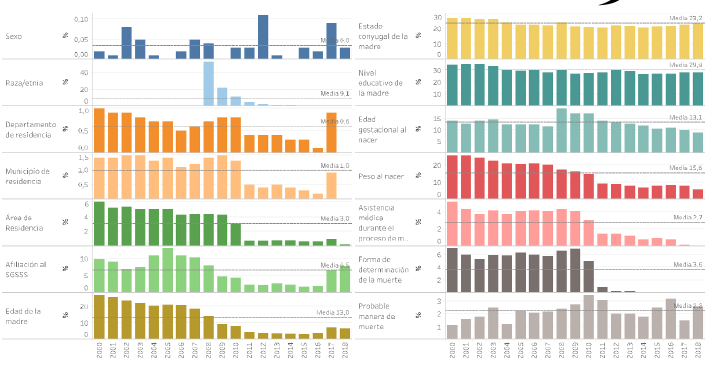 La característica con menor omisión fue el sexo (99,97 %), seguida del departamento de residencia (99,4 %) (Figura 2). En contraste, se encuentran aspectos evaluados en las muertes de menores de un año, como el nivel educativo y el estado conyugal de la madre, con pérdidas del 30,5 °% y 23,6 °%, respectivamente.