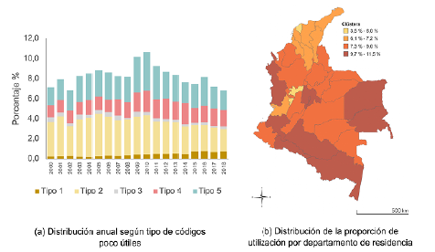 A nivel departamental, el menor porcentaje de utilización de códigos poco útiles se presentó en San Andrés y Providencia (3,5 %), mientras que en Cauca se observó la mayor proporción (11,5 %) (Figura 3b). A nivel municipal, en 95 municipios no se utilizaron códigos poco útiles (30 municipios de Boyacá y 20 de Santander); en contraste, en Cacahual (Guainía) el 50,0 % de las defunciones tenían estas causas de defunción.