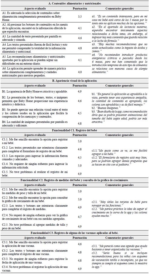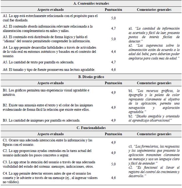 Un conjunto de 7 jueces expertos fue seleccionado e invitado a realizar la evaluación de los contenidos alimentarios y nutricionales consignados en la aplicación, y de sus funcionalidades en general. El panel de jueces estuvo conformado de forma multidisciplinaria por especialistas en áreas de la salud con experiencia en materia de nutrición y alimentación complementaria. La validez de los ítems considerados se midió de forma cuantitativa en la escala Likert especificada de 1 a 5 y adicionalmente se tuvo en cuenta un espectro de comentarios de forma cualitativa. Los resultados obtenidos se detallan en la Tabla 1, asignando las letras A, B y C a cada dimensión. En la dimensión A de contenidos textuales se tuvieron en cuenta 6 ítems o aspectos evaluados que en promedio puntuaron 4,73, indicando una aprobación positiva de los especialistas para la didáctica y presentación de los contenidos educativos de alimentación complementaria y cuidados nutricionales. En la dimensión B de diseño gráfico el puntaje común de 4,9 fue bastante alto, ubicando el aspecto visual y recursos gráficos de Baby Home como una de sus fortalezas. En la dimensión C de funcionalidades similarmente se obtuvieron puntajes destacables para un promedio de 4,85, reflejando la claridad y facilidad de uso de la app. Los comentarios captados de los jueces en general fueron favorables para cada dimensión con la anotación de algunas sugerencias específicas en los contenidos alimentarios (comentario a2).