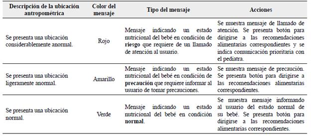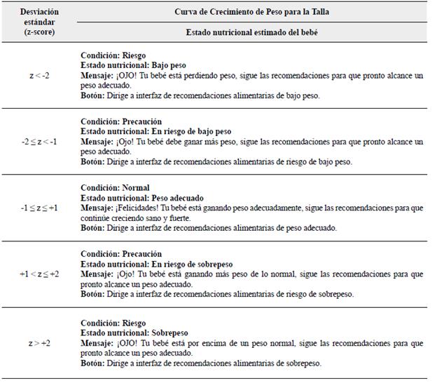 En miras de indicar automáticamente el estado nutricional del lactante según la ubicación de sus mediciones de peso-talla en la curva de crecimiento de peso para la talla de la OMS16, se estableció un conjunto de estados definidos en cada intervalo de desviación estándar o z-score como sigue: