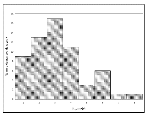 Los resultados de los parámetros de exposición y los cuartiles de la distribución de las medidas de dosis en los equipos intraorales se presentan en la Tabla 1. El Q3 del Kai en los equipos digitales (CR/DR) es de 2,55 mGy y 4,84 mGy para los equipos análogos de película tipo E (película rápida). La Gráfica 1 muestra la distribución de frecuencias Ka,i través de un histograma para los equipos intraorales. El porcentaje más alto de equipos está en el rango de 2,0 - 3,0 mGy. El 50 % de los valores de Kai están entre 1,59 y 3,3 mGy. La distribución tiene asimetría positiva, los datos se concentran en la parte inferior de la distribución. El 25 % de los valores de Ka i más altos están más dispersos que el 25 % de los valores más bajos. Hay tres equipos intraorales que presentan valores atípicos mayores a 6 mGy. Se encuentra que el DRL para los dos tipos equipos de radiografía intraoral, análogos y digitales, en la ciudad de Bogotá, es de 3,3 mGy.