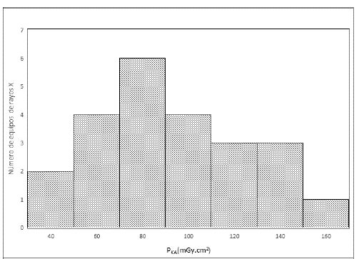 Los resultados de los parámetros de exposición y los cuartiles de la distribución de las medidas de dosis en los equipos de radiografía panorámica se presentan en la Tabla 2. La Gráfica 2 muestra la distribución de frecuencias del PKA través de un histograma para los equipos de radiografía panorámica. El porcentaje más alto de equipos está en el rango de 60 a 80 mGycm2. Los valores del PKA varían entre 26,6 y 143,4 mGycm2. Para los 23 equipos de radiografía panorámica incluidos en el análisis se encuentra que el Q3 del PKA es de 103,9 mGycm2.