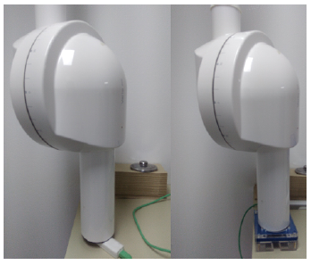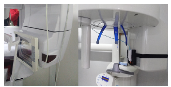 Para las medidas de los parámetros de exposición a la salida del cono espaciador para equipos intraorales y en la parte frontal del receptor de imagen para equipos de radiografía panorámica, Figura 1 (izquierda) y Figura 2 (derecha), se utilizó el sensor R/F del Raysafe X2 (Fluke Biomedical, USA). Para las medidas del Kai en equipos intraorales se utilizó el sensor R/F y para medir el PKA en equipos de radiografía panorámica se utilizó la cámara de ionización Vacup DAP (Vacudec, Germany) colocada a la salida del colimador del tubo de rayos X e intercepta todo el haz, Figura 2 (izquierda). Esta metodología se utiliza porque no requiere que un paciente esté presente durante la medición y está basada en el reporte técnico No. 457 del Organismo Internacional de Energía Atómica (IAEA, por sus siglas en inglés)14.