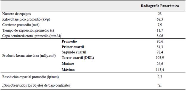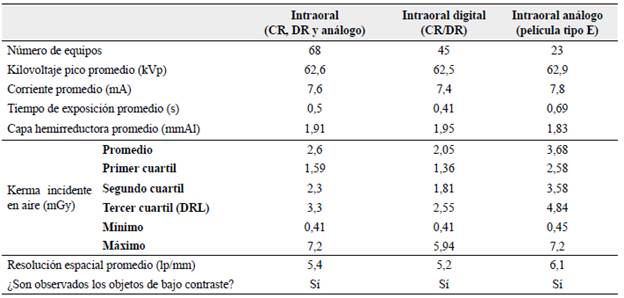 Metodología: Se evaluaron los parámetros de exposición radiográficos de los equipos y la calidad de imagen en 68 equipos de radiografía dental periapical y 23 equipos de radiografía panorámica. Se estimaron las magnitudes dosimétricas de kerma incidente en aire (Kai) en equipos intraorales para la radiografía de un maxilar molar de un adulto y el producto kerma aire-área (PKA) en equipos de radiografía panorámica en un examen de un adulto estándar.