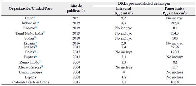 En cuanto a los resultados en otros estudios a nivel internacional, Tabla 3, la evolución de las magnitudes dosimétricas muestra una disminución con el tiempo de los niveles de referencia para diagnóstico (no son estáticos) para los dos tipos de modalidades de radiografía dental. Los niveles de referencia para diagnóstico obtenidos en Bogotá en este estudio, comparados con los resultados a nivel internacional, evidencia que en la radiografía intraoral están por encima de los obtenidos más recientemente en países como España, Emiratos Árabes, Reino Unido e Irlanda. En el caso de radiografía panorámica, vemos que hay una mayor fluctuación de los niveles de referencia para diagnóstico dependiendo del país, por lo que el valor obtenido en este estudio es comparable con el de países como India, Sudán y República de Corea. El valor encontrado para el DRL para radiografía dental intraoral se encuentra fuera del rango recomendado para los países de Europa en 2014 (5 - 7 mGy)17. Sin embargo, se debe tener cuidado al comparar de manera directa los resultados de este estudio con los de otros países, ya que los estudios son afectados por diferencias en el tamaño de la muestra, tipo de proyecciones y dosimetría, los parámetros técnicos de exposiciones como el kVp o el tiempo de exposición, las fechas en la que fueron realizados los estudios, entre otros.