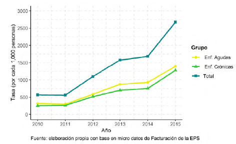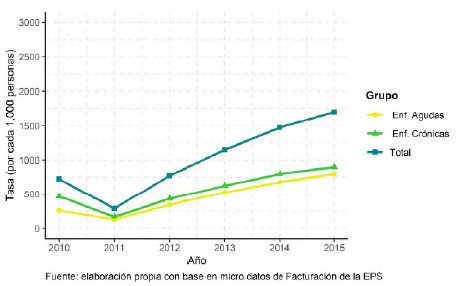 La tasa de utilización de servicios por enfermedades agudas es mayor a la tasa de utilización por enfermedades crónicas. En la Figura 1, se observa que durante 2014-2015 hubo un fuerte incremento de la utilización de servicios derivados de enfermedades agudas, principalmente por traumas y enfermedades osteomusculares. Por su parte, la tasa de utilización de servicios crónicos es explicado fundamentalmente por la enfermedad cardiovascular.