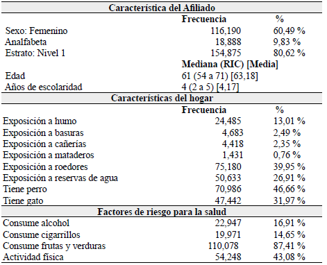 La Tabla 1 muestra las principales características de la muestra. De un total de 192 095 individuos mayores a 50 años, el 60,4 % resultó ser mujer y un 39,6 % corresponde a hombres, con una edad promedio de 60,2 años, y con un promedio de 3,5 años de escolaridad. Por cada persona en nivel medio, hay 4 personas en nivel bajo y 51 en nivel alto. Haciendo referencia a las características de la unidad doméstica, se observa la presencia de roedores en aproximadamente el 40 % de los hogares. Respecto a los factores de riesgos para la salud, el 57 % no realiza actividad física adecuada y un 12,5 % no consume adecuadamente las porciones necesarias de frutas y verduras.
